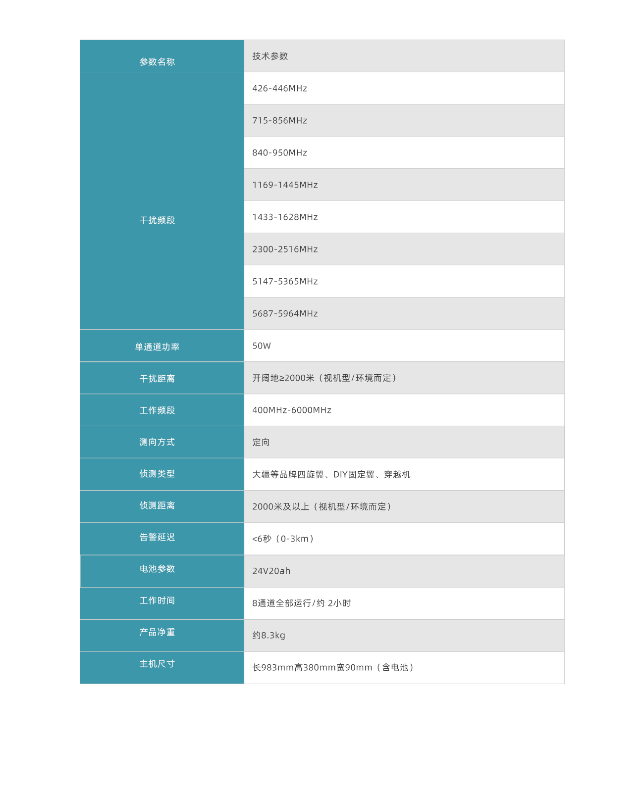 干扰参数:频段0.4G/0.8G/0.9G/1.4G/GPS/2.4G/5.2G/5.8G 距离≥2000米(视机型/环境而定)